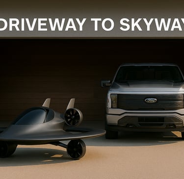 Imagine a future where your daily commute begins in the comfort of your own driveway and seamlessly transitions to the open skies. The “Driveway to Skyway” concept represents a bold leap in personal mobility, combining the practicality of ground transportation with the freedom of flight. A sleek, aerodynamic AirCar sits alongside a modern electric truck, symbolizing the convergence of advanced automotive engineering and next-generation aviation technology. This vision redefines convenience, offering a lifestyle where roads and skies are no longer separate paths but interconnected routes to limitless possibilities.